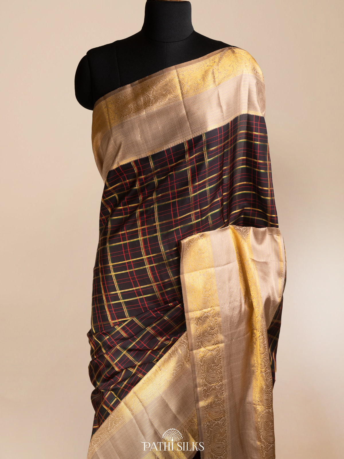 Multicolour checks black Kanjivaram Silk Saree