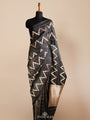 A black Mushroo satin saree featuring handwoven gold zari in a striking half-and-half design. The body is adorned with alternating zig-zag and vertical gold stripes, creating a dynamic rhythm across the drape. The contrast between bold patterning and deep black fabric gives the saree a contemporary elegance while maintaining the richness of traditional weaving.