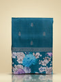 A handwoven Tussar saree in deep teal blue, scattered with silver buttas that shimmer subtly across the body, lending it a serene, sophisticated charm. The rich silver zari pallu flows gracefully, framed by a floral-printed satin border that adds a gentle, artistic accent to the traditional weave. A matching floral-printed blouse with a satin border completes the ensemble, creating a look that feels both elegant and thoughtfully curated for special occasions.