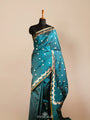 An emerald Banarasi silk saree, its body adorned with intricate gold zari motifs that catch the light with every movement. The rich green hue and delicate detailing evoke a sense of celebration and heritage, draping you in confidence and poise while letting the beauty of traditional craftsmanship shine.