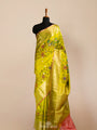 A grey Ikkat saree enriched with hand-painted Kalamkari designs that bring an artisanal, expressive depth to the body. A teal-blue Ikkat panel sits just above the border, adding a distinctive layer of pattern and colour. The matching blouse continues the hand-painted detailing, creating a festive ensemble that feels thoughtfully crafted and visually cohesive.