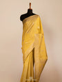 A yellow Moonga Tussar Banarasi saree in a traditional weave, dotted with delicate silver buttas that catch the light with subtle elegance. The soft yellow body and refined detailing make it a graceful choice for anyone seeking a classic yet distinctive drape.