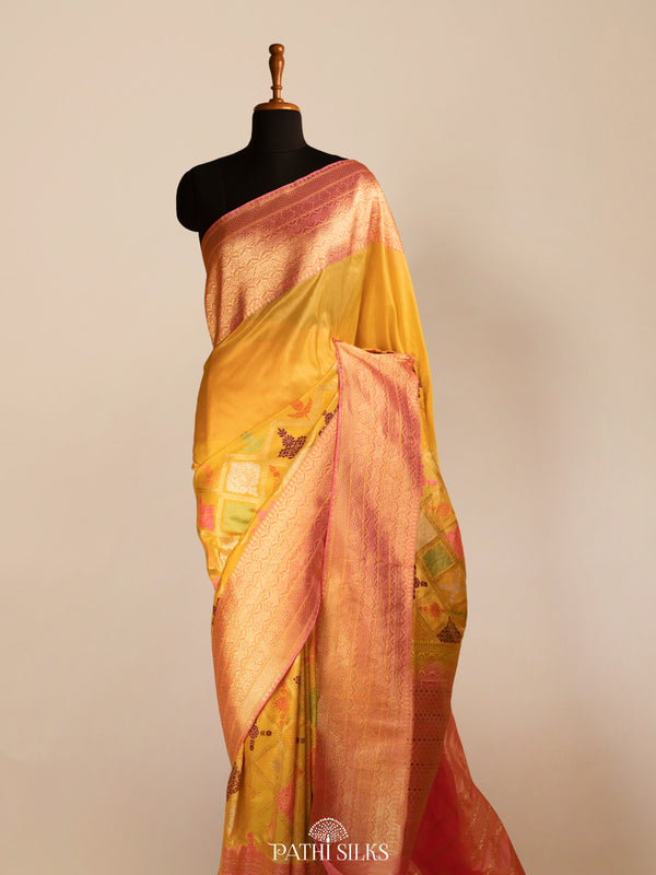 A Banarasi saree crafted in traditional Kadwa weaving, its body enriched with intricate multi-colour Meenakari work placed gracefully above the border. The gold zari border lends a classic richness, while the contrasting onion-pink border, pallu, and blouse bring a refined vibrance to the drape. Together, the interplay of colour and craftsmanship creates a saree that feels regal, elegant, and timeless.