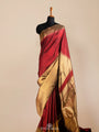 A maroon Kanjivaram saree, its rich body accented with a rising pattern in pure gold zari that catches the light with every fold. The temple border adds structure and traditional grandeur, framing the drape with precision and elegance. Together, the motifs and border create a regal presence, giving the saree a distinguished character.