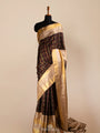 A vintage black Kanjivaram saree featuring multicolour silk checks interspersed with zari stripes, lending depth and texture to the body. The grey Korvai border is detailed with Anapakshi motifs, reflecting the precision of classic handloom artistry. The interplay of dark base, vivid checks, and intricate motifs gives the saree a bold and elegant presence, ideal for occasions where you want to make a statement.