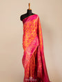 An orange Kanjivaram that comes alive with delicate pink motifs which dance across the body, bringing warmth and vibrancy to the drape. A rani pink Korvai border frames the saree with elegance, featuring a vintage Jamdhani weave inspired by Paithani designs. An orange selvedge completes the palette with a subtle highlight. Together, the colours and intricate detailing create a joyful, festive charm, perfect for a bride.