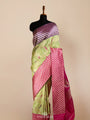 A pista-green Banarasi saree enriched with handwoven jamdhani work that lends texture and delicacy across the body. The buttas echo the motifs of the borders, creating a cohesive rhythm through the weave. Its Ganga-Jamuna borders in rani pink and purple bring a vivid, traditional contrast, while touches of gold zari add a soft radiance. The final statement is festive, detailed, and unmistakably rooted in Banarasi craft.