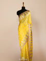 A beautiful yellow Iktara silk Banarasi saree adorned with delicate meenakari motifs that bring colour and intricacy to the weave. The small border, woven in antique and silver zari, adds a refined shimmer without overpowering the body. The result is a festive saree that feels bright, elegant, and richly detailed in a distinctly Banarasi way.