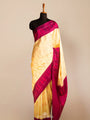 An original handwoven ikkat silk saree, its body adorned with delicate floral digital print motifs that flow across the fabric like a gentle bloom. The pink border and pallu frame the saree with a soft yet striking contrast, giving it an elevated and graceful presence that balances contemporary artistry with traditional weaving.